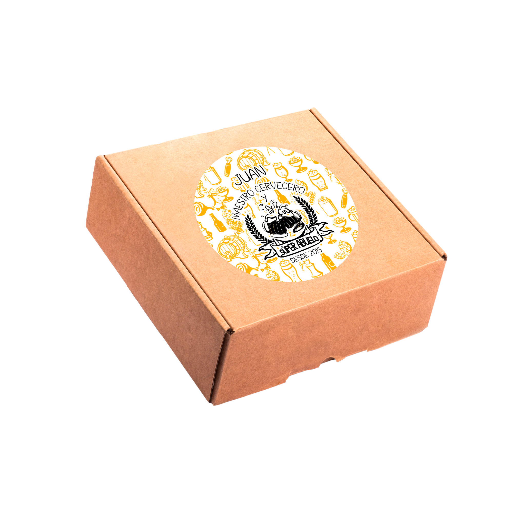 Impresa por ambos lados, por un lado va el nombre del abuelo y la frase «Maestro cervecero y súper abuelo» con el año desde qué es abuelo y por el otro lado los nombres de los nietos.